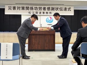 先日、災害対策関係功労者感謝状伝達式(松江国道事務所)が