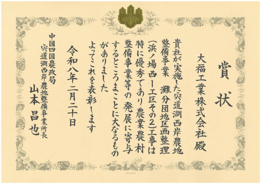 宍道湖西岸農地整備事業所長表彰を受賞しました。